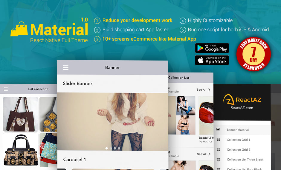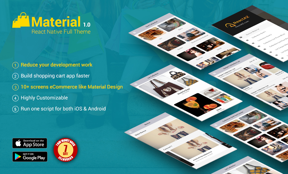Best material for ecommerce theme by react native. Easy to setup basic the collection / listing screen. All components are easy to customize and reuse with example screen on the source. Check it out.