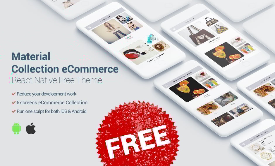 Best material for ecommerce theme by react native. Easy to setup basic the collection screens. All components are easy to customize and reuse with example screen on the source. It’s FREE!