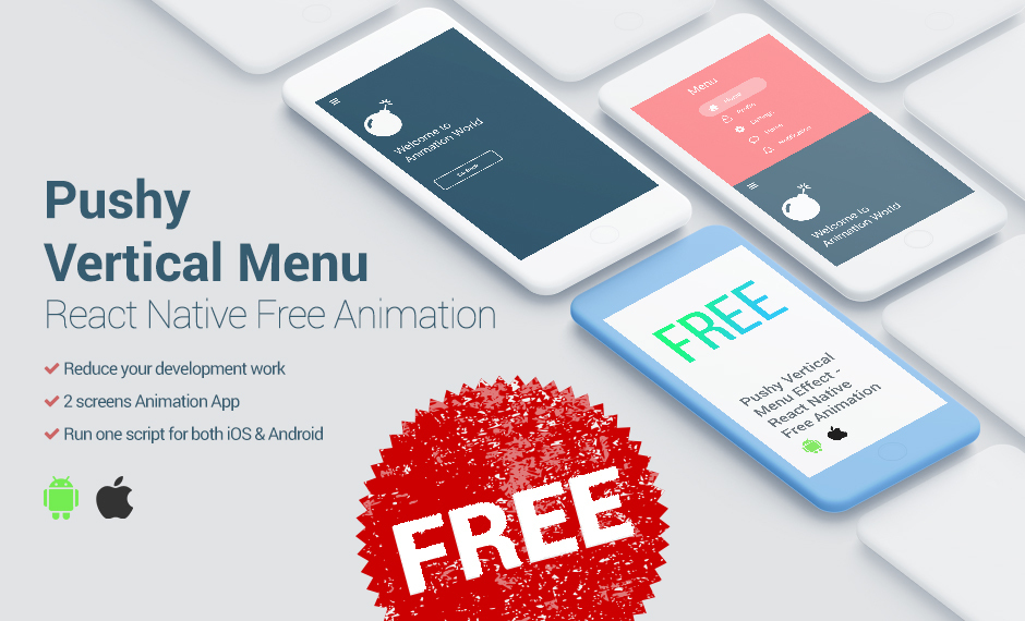 Pushy Vertical Mobile Menu Effect - React Native Free Animation. It helps you create the pushy vertical menu quickly and professionally. It's easy to customize and develop. Yeah, It's Free!